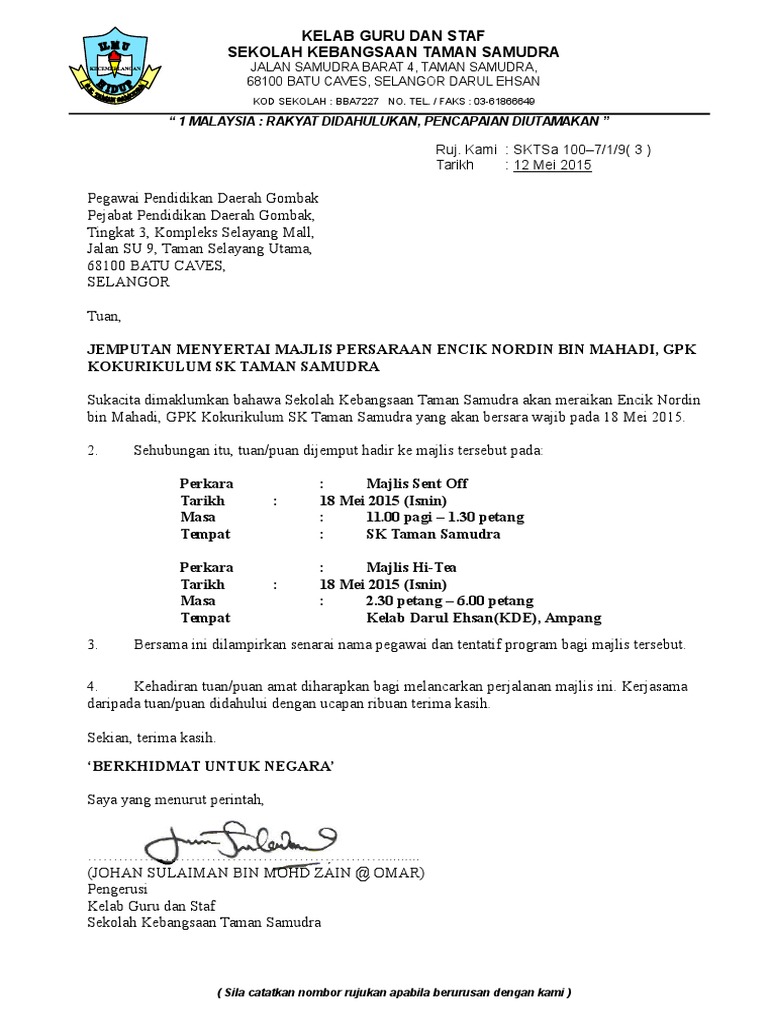 Semoga perkongsian ini bermanfaat untuk anda. Siti Nurfatimah binti Hussen Setiausaha Program Berambeh Bersama Pelajar UUM Jabatan Kebajikan Masyarakat Bahagian Sibu Tingkat 6 Wisma Sanyan No1 Jalan Sanyan 96000 Sibu Tel. Contoh Surat Jemputan Majlis.